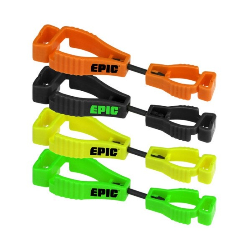 The EPIC® Glove Clip Holder features upper jaws to secure belt loops or pockets, and lower jaws to grip and hold gloves. Made from nonconductive and noncorrosive material, with a rubber linking arm designed to break away in the event of glove entanglement. Available in four colours.